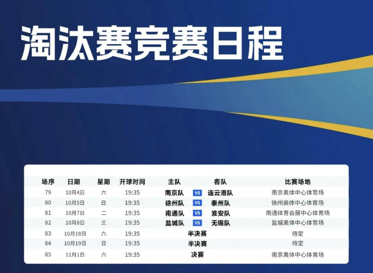 接着,在10月5日晚间,排名第三的徐州将在主场对阵第六泰州。两队本赛季曾在客场交手,徐州以2-1逆转获胜。同样在7号晚上,领头羊南通将迎战排名第八的淮安。南通曾取得十连胜,而被淮安终结,这场淘汰赛也充满变数。而第四名盐城将在8号晚间主场迎战排名第五的无锡,两队实力相近,比赛结果难以预料。